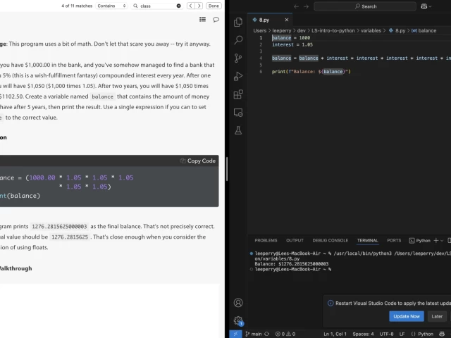 Again, fairly basic stuff, but tonight I completed the 'Variables' section of LaunchSchool's 'Introduction to Programming with Python' book.