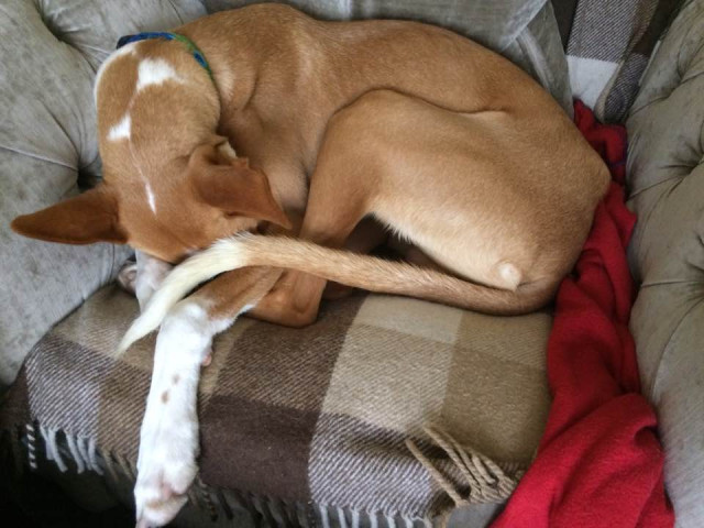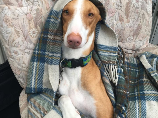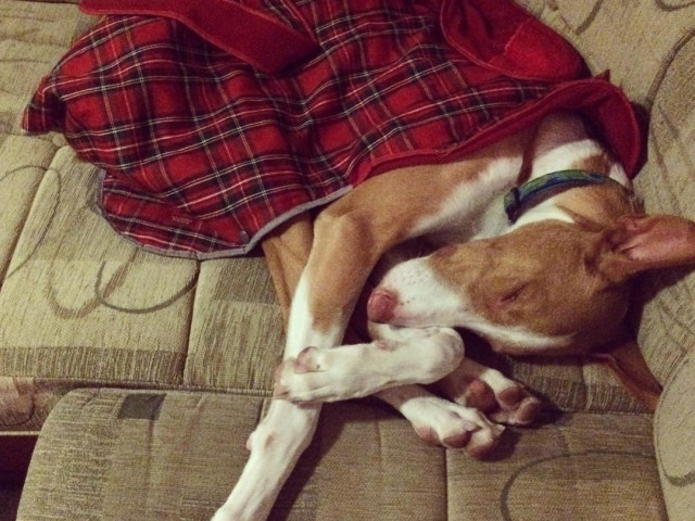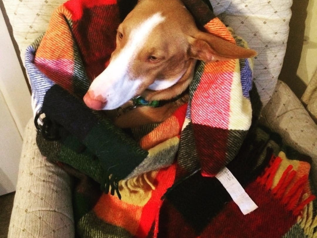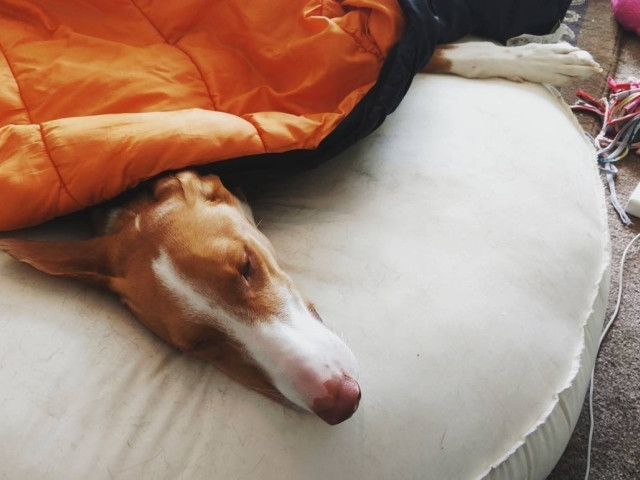 bayLee doing an impersonation of a Canine burrito #podenco #dogsofinstagram #sighthounds #winter #winteriscoming
