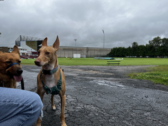 4 weeks and a day to go, and Caoimhe is so excited she had to drag Leo for a peek at the Turf this morning. Who else cannot wait for next season? #eflChampionship #football #burnleyFC #podencos #dailyDog