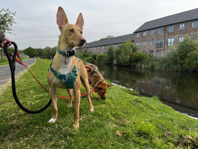 A quick shot of Caoimhe and Leo from their morning walk today on the Leeds Liverpool Canal near Reedley Marina. Caoimhe is getting excited about a potential breakfast top-up on the tow-path. #podencos #dailydog