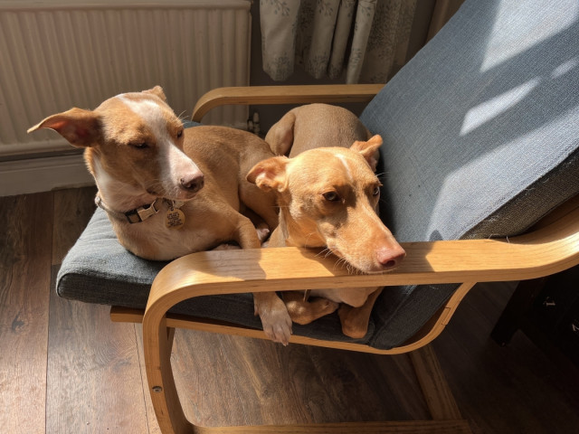 Office dogs photo of the day, here's bayLee (Ibicenco) and Leo (Andaluz) pretending not to like each other on the sofa.