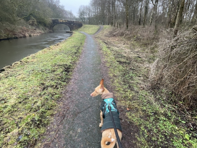 Here is Mr. Leo enjoying his walk on the Leeds Liverpool Canal between Burnley and Nelson today.