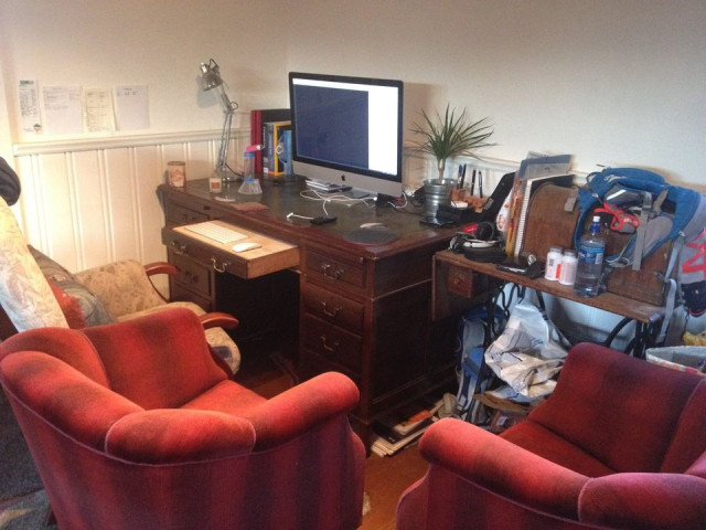 Using a false table in the central drawer to create a lowered workstation. Just needs a light varnish