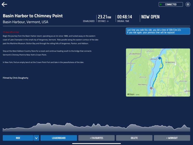 This page looks at the Basin Harbor to Chimney Point route on Fulgaz filmed by Chris Dougherty. Read on for route metrics, description, images and my own ride data.