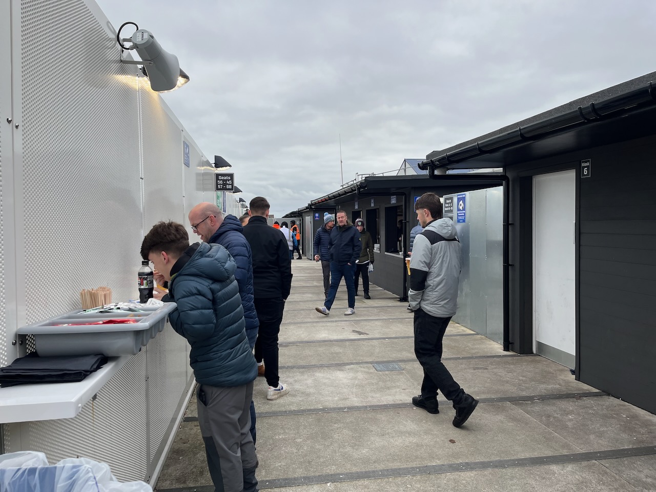 The catering areas in the Milton End are housed on a mezzanine behind the stand, at the top of the entrance/exit stairs (there is a disabled lift providing access up/down). The area is open air, with privacy screens protecting visitng supported from the local children and their abuse displayed on an Etch a Sketcha in the windows (for real).