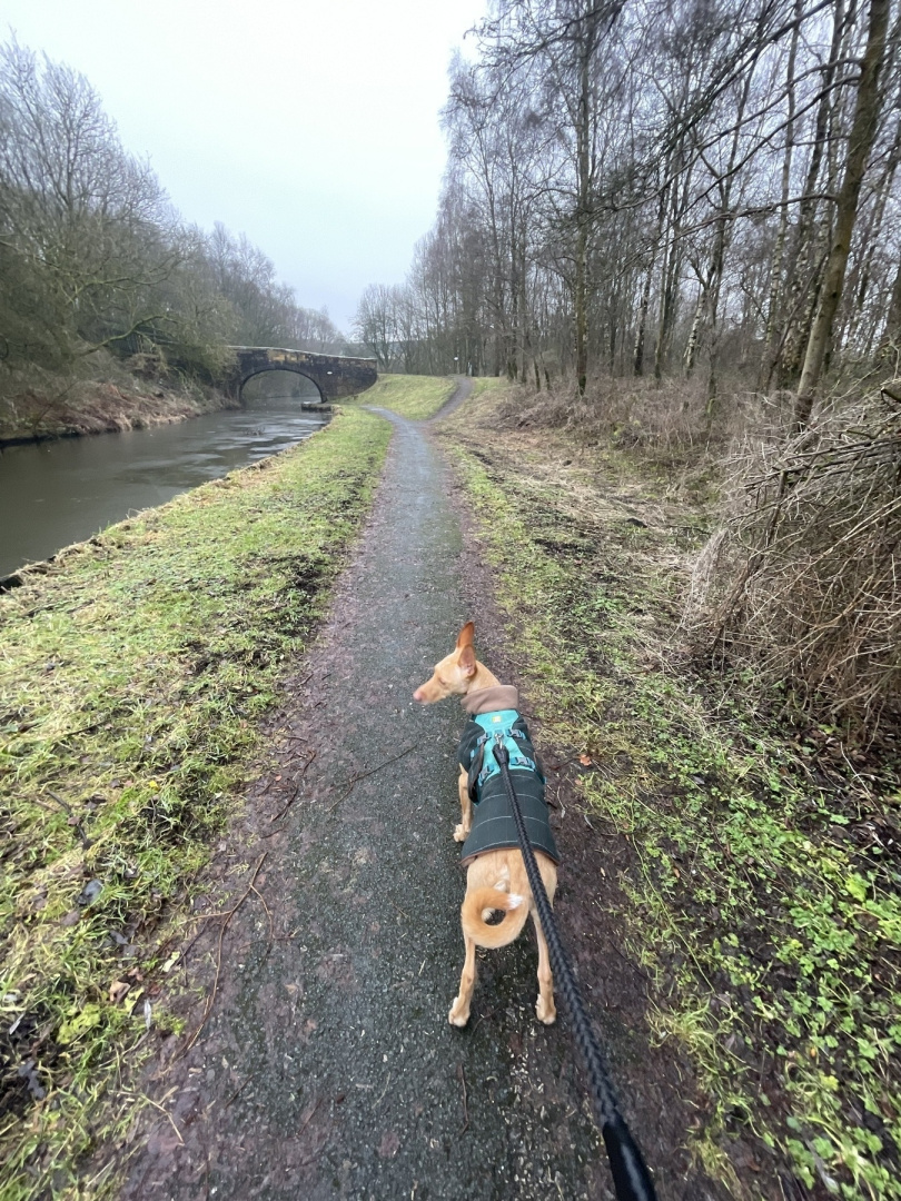 Here is Mr. Leo enjoying his walk on the Leeds Liverpool Canal between Burnley and Nelson today.