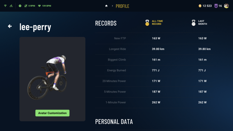 A quick preview of the new personal records section available in the profile section in the Rouvy application.