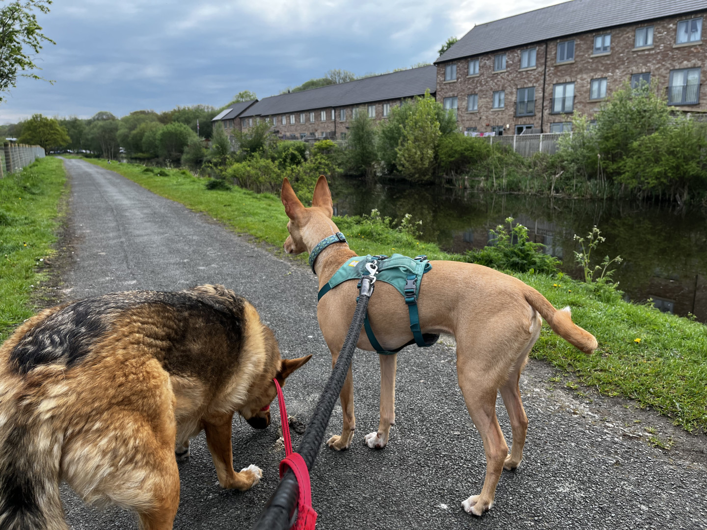 A quick shot of Caoimhe and Leo from their morning walk today on the Leeds Liverpool Canal near Reedley Marina. Caoimhe is getting excited about a potential breakfast top-up on the tow-path. #podencos #dailydog