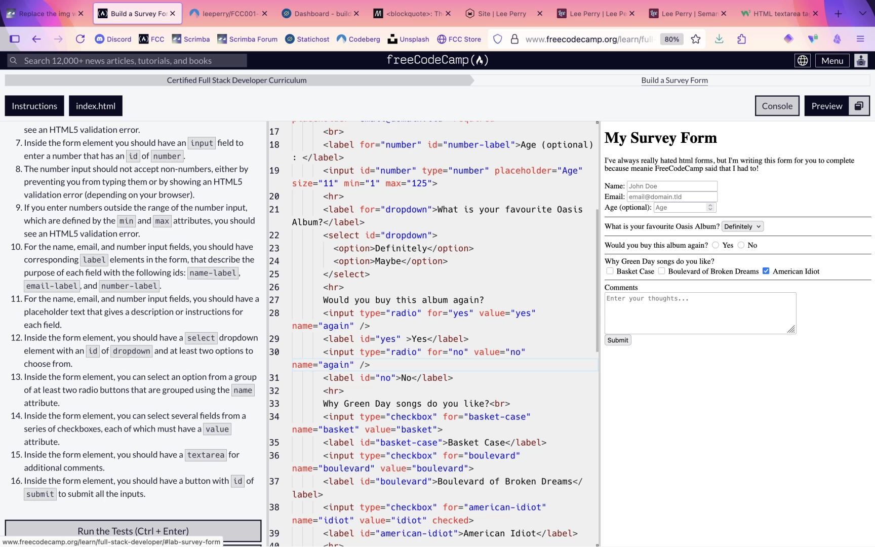 I've always hated html forms, I don't think I've ever created one from scratch that actually worked. So hopefully in working through the FCC forms module tonight, something stuck.